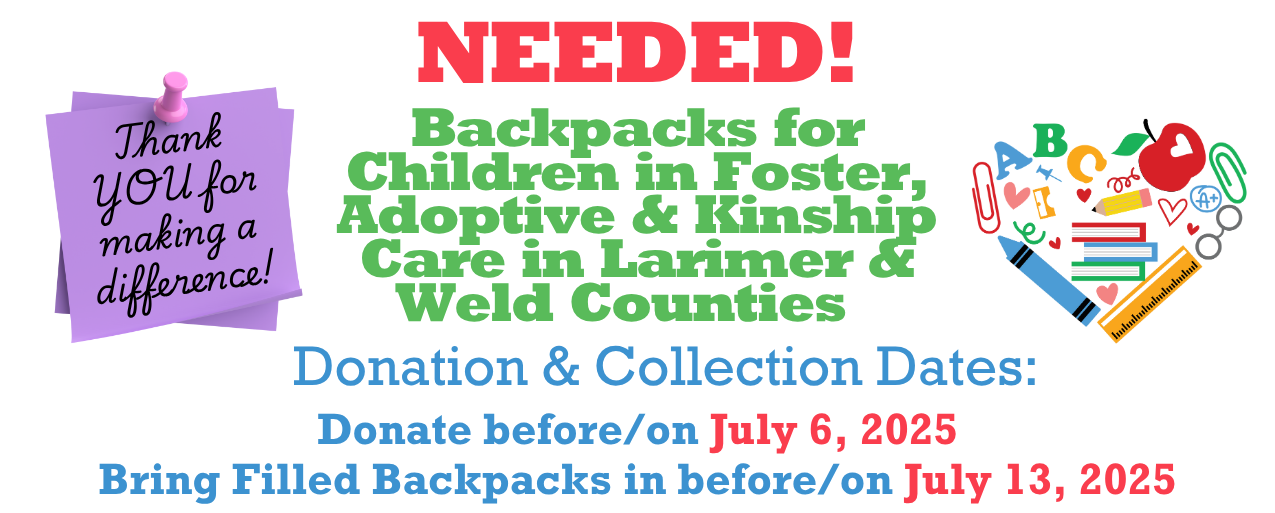 We invite you to participate in this year’s backpack and school supply drive benefiting A Backpack of My own, which provides age-appropriate backpacks filled with school supplies to children in Larimer & Weld County Foster Care, Adoptive Care and Kinship Care.